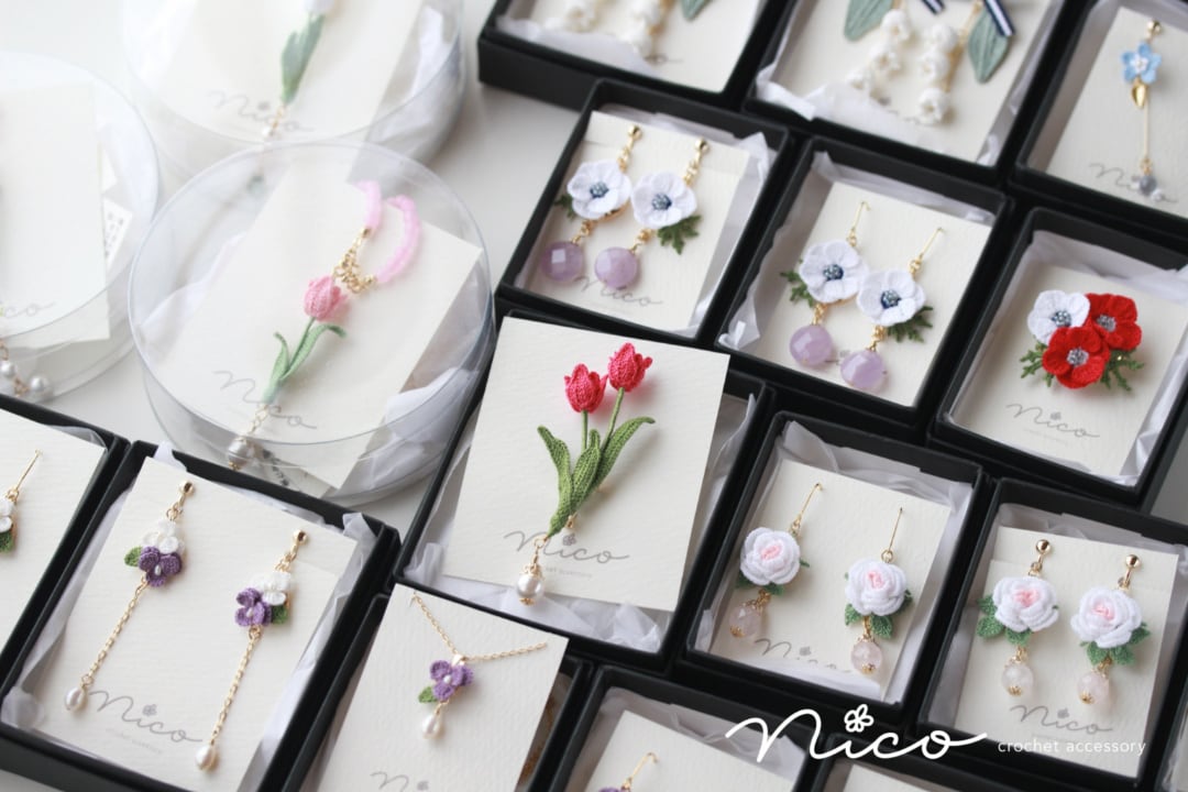 かわいいアクセサリーでご機嫌な1日を。 「かわいい!」「きれい!」思わずこぼれる笑顔とときめきは、毎日をがんばる私たちの活力になるはず。あなたのそんな笑顔のきっかけになれるよう、ひと目一目心を込めて丁寧に編んだレース編みアクセサリーをお届けします。