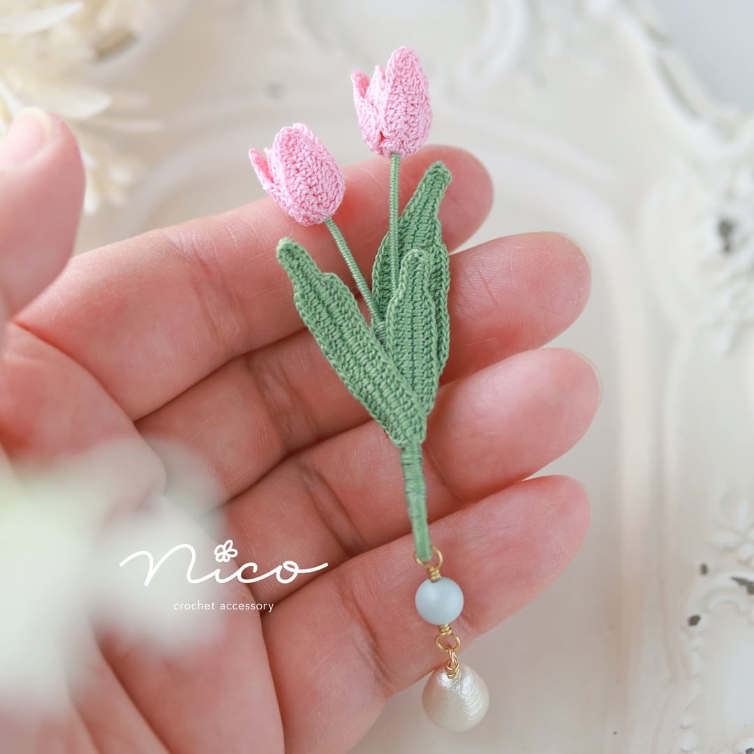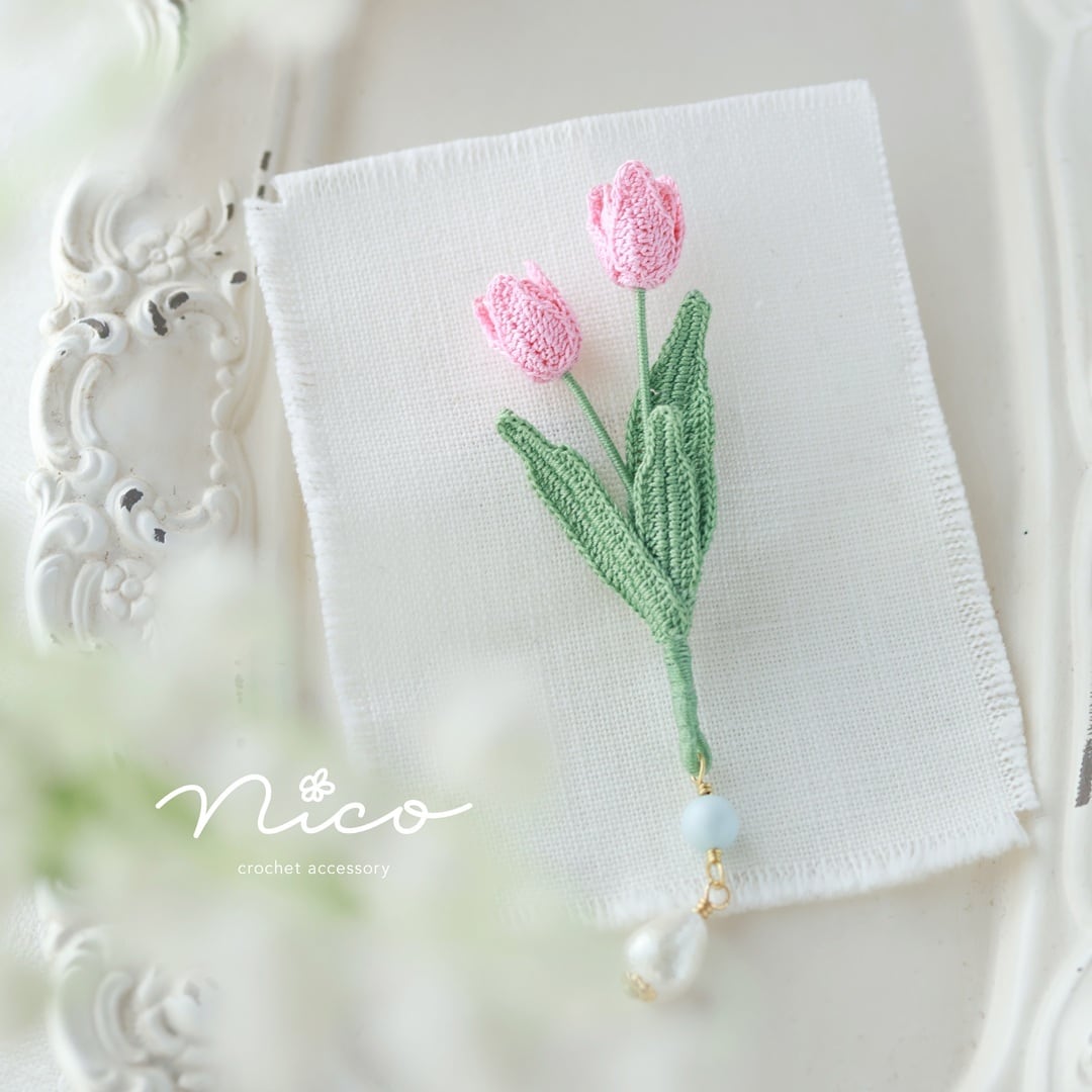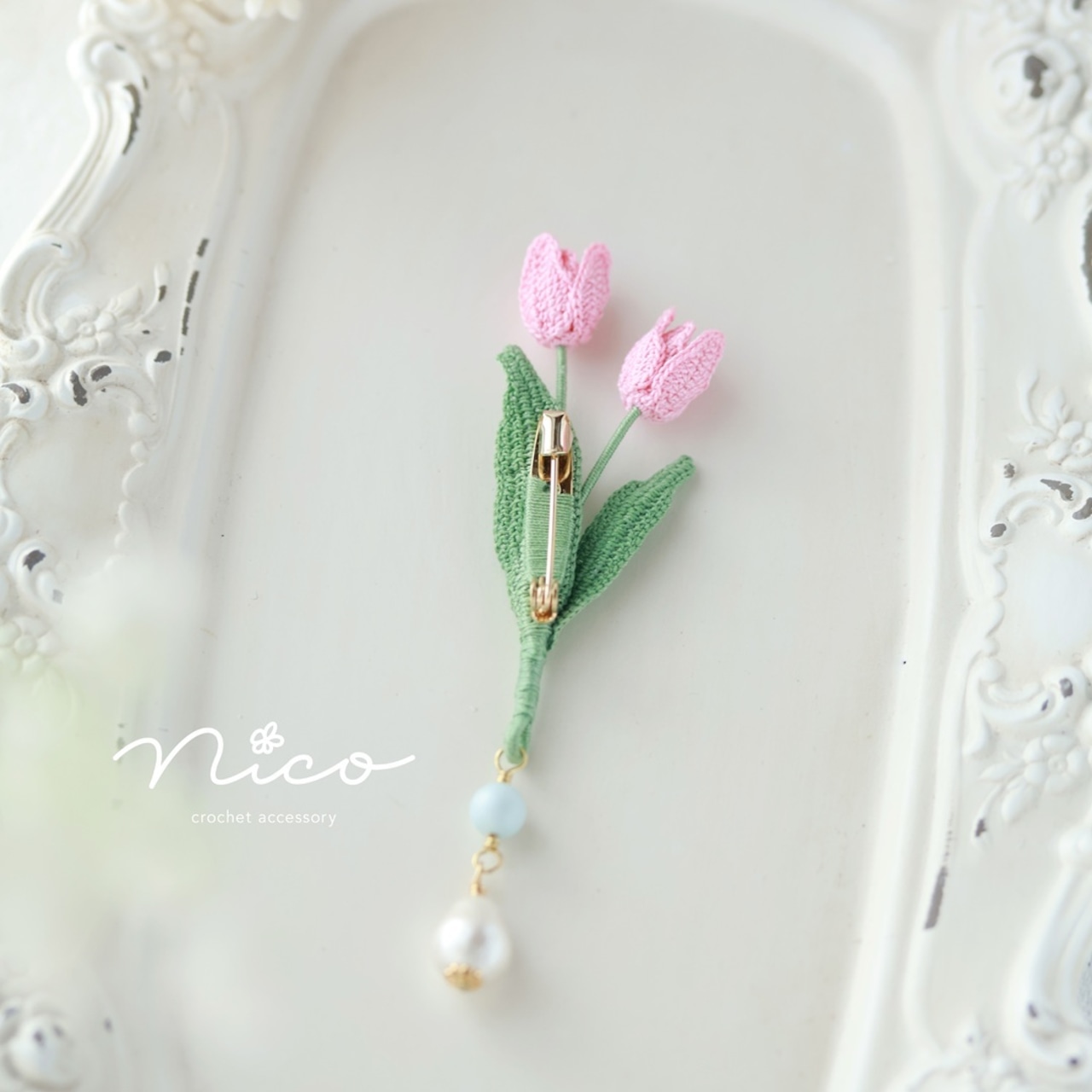 春の訪れを告げるチューリップ。その愛らしい姿をレース編みで表現した特別なブローチです。