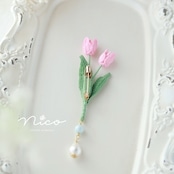 可愛らしいピンクのチューリップには、爽やかな水色のパールと、コットンパールを合わせ、ロマンチックな色合わせにしました。