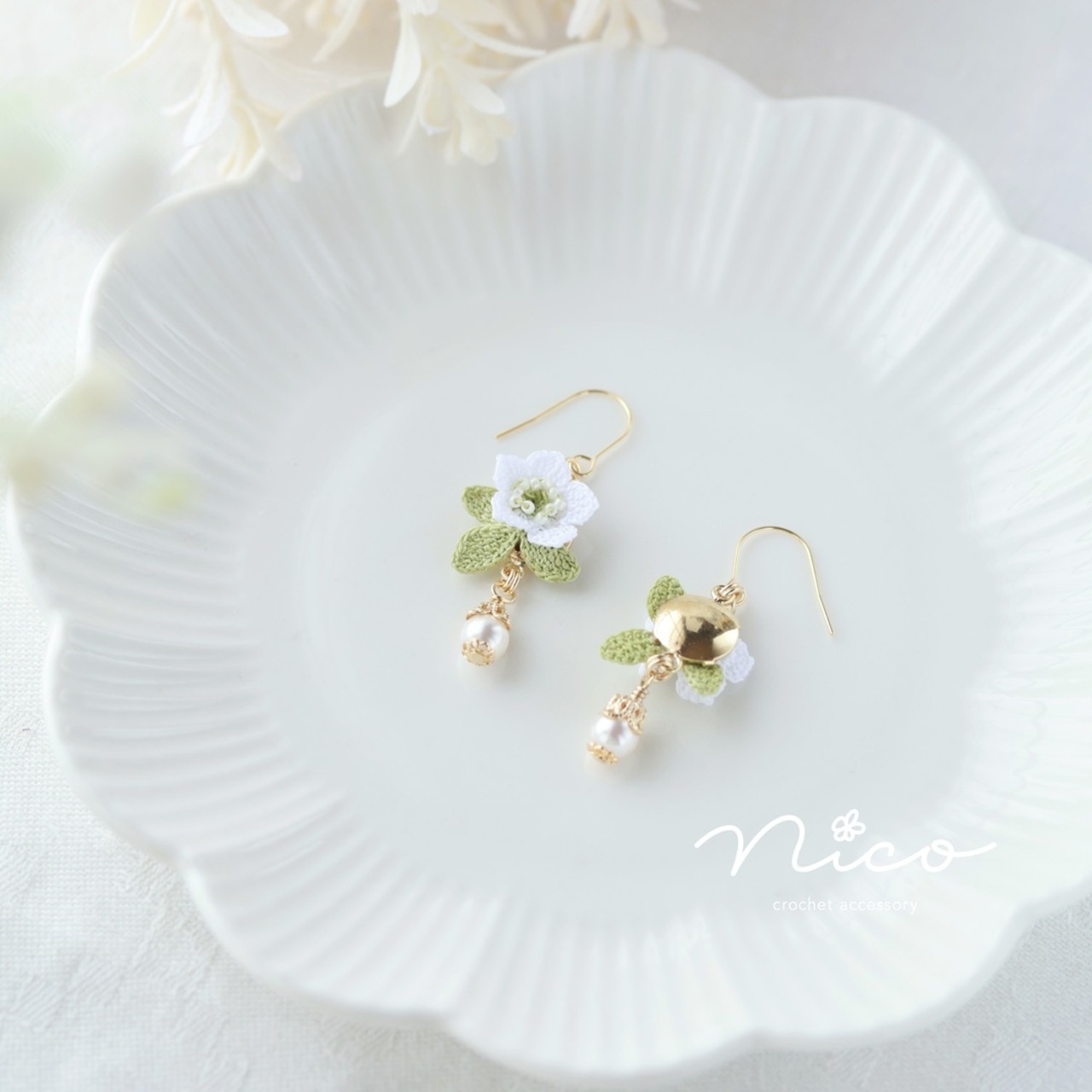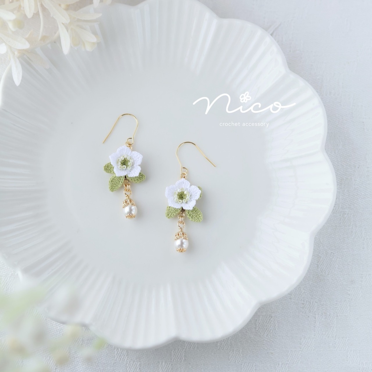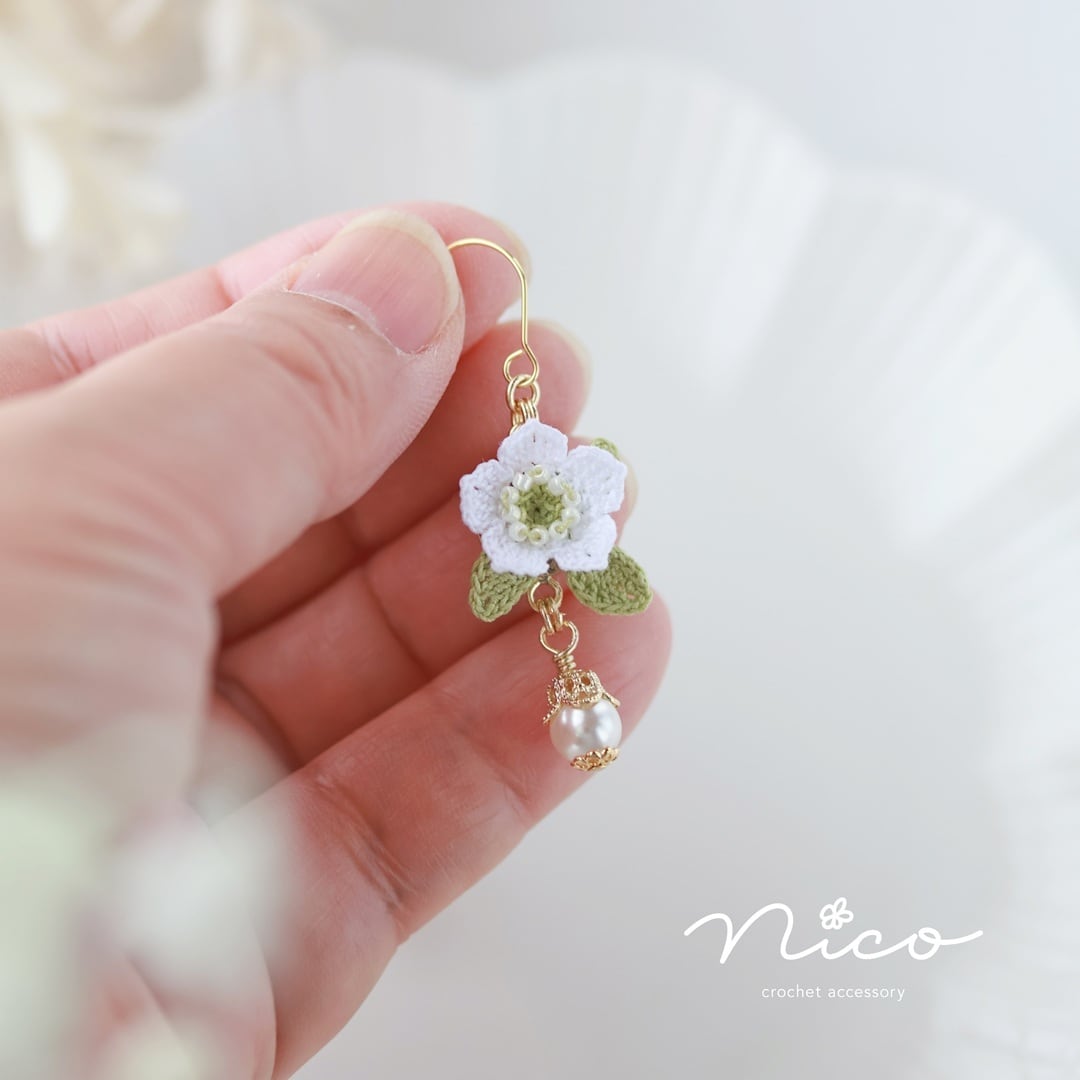 モチーフは型崩れしにくいように少し固めていますが、繊細さや風合いを損なわない程度にとどめています。クリスマスローズは立体的なモチーフのため、着用時にお花モチーフ部分をぎゅっとつぶしてしまわないようにして、長くご愛用くださいね。